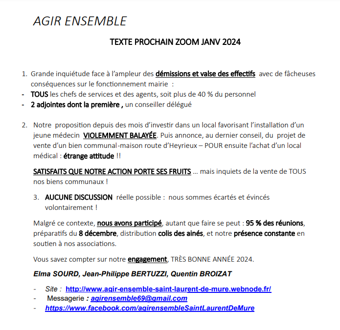 Nous restons comme à notre habitutde à votre disposition pour échanger. 07 62 05 47 71 agirensemble69@gmail.com