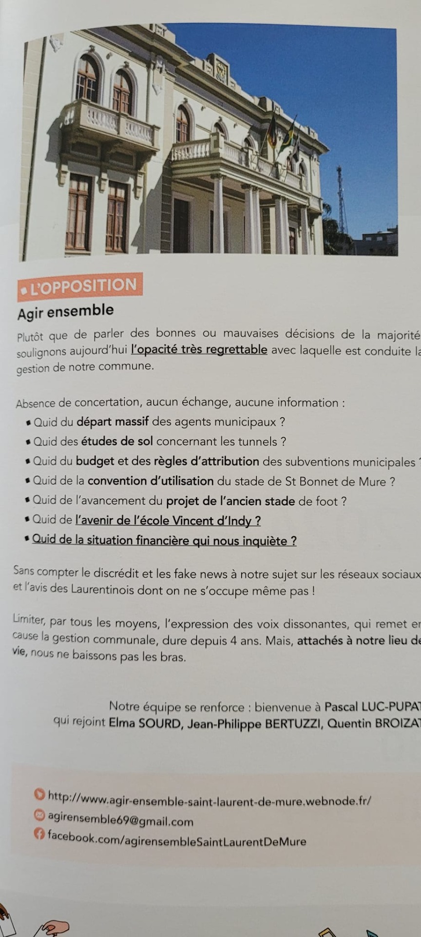 "Elus au même titre que la majorité, les membres d'AGIR ENSEMBLE exercent leur mandat dans l'intérêt de notre commune et de ses habitants, et dans le respect de chacun. Dans cette crise sanitaire majeure, c'est la municipalité toute entière qui doit oeuvrer ! Sans présence sur le site institutionnel Mairie, AGIR ENSEMBLE vous accueille :