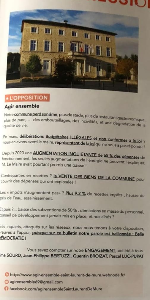 Nous sommes contraints par le Maire et son équipe à donner notre texte 45 jours à l'avance ! De cette manière, la majorité a tout le loisir de contrer nos dires... ce qui est encore une fois CONTRAIRE Á LA LOI! Article L2121-27-1 : " il est prévu dans le bulletin municipal un espace réservé à l'expression de l'opposition. À la suite de cet espace, le maire ne peut pas répondre aux éléments avancés par l'opposition dans la même publication.