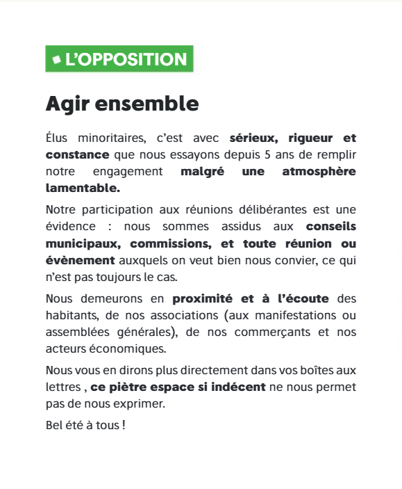 Vous trouverez ci-dessous notre message au sein du Bulletin municipal où l'on nous laisse toujours qu'une place limitée, voire insignifiante !