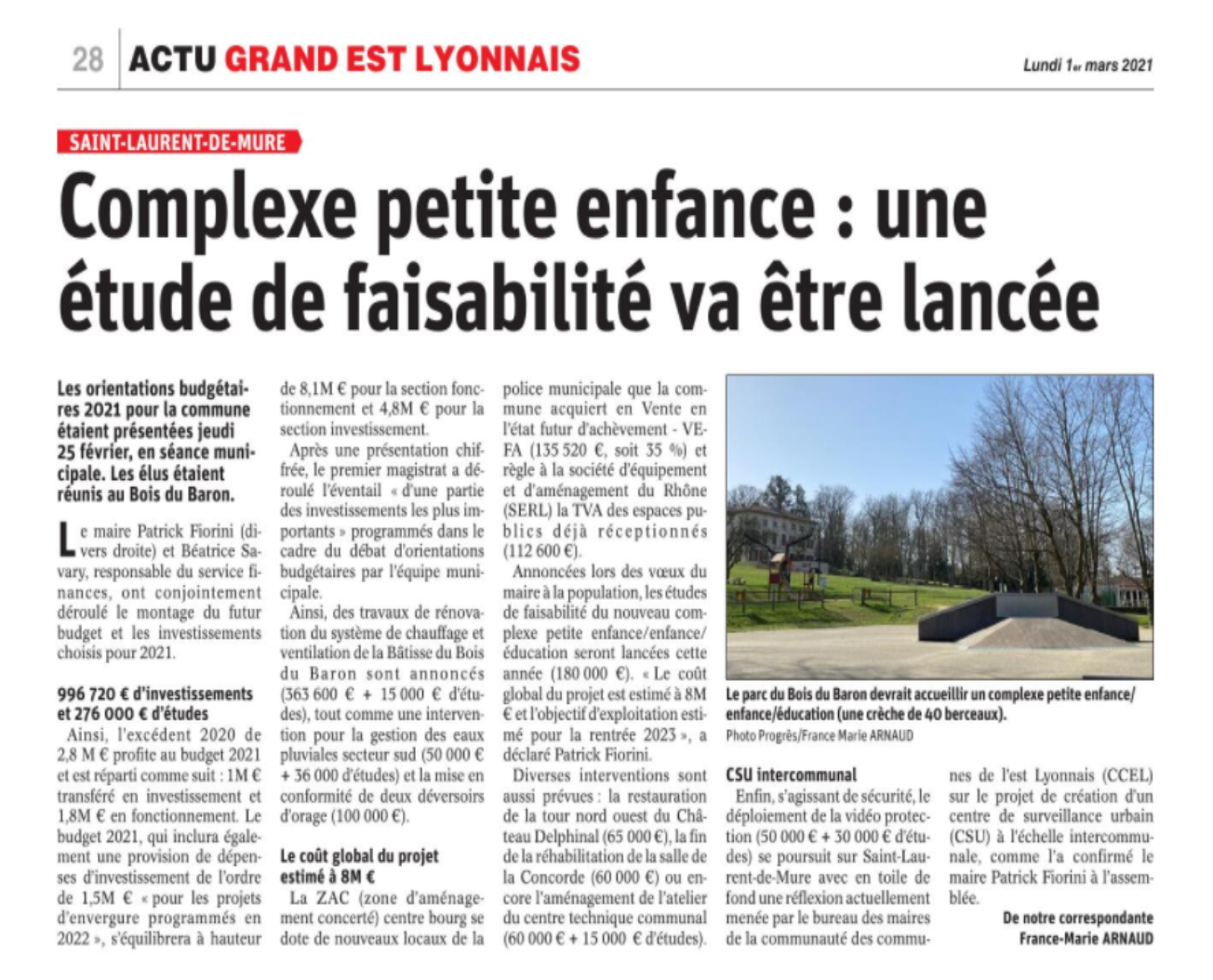 Sur notre commune, nous avons la chance de bénéficier de cet espace vert prisé, profitable, un espace de respiration qu'est le « Bois du Baron », ultime poumon vert pour St Laurent de Mure : ouvert au public, qui favorise pour les familles des activités de détente de plein air, qui permet aux gens de s'y rencontrer, une proximité de vie, d'avoir un lien social, une vie dans le village, sur un lieu partagé avec un intérêt identifié et réel.