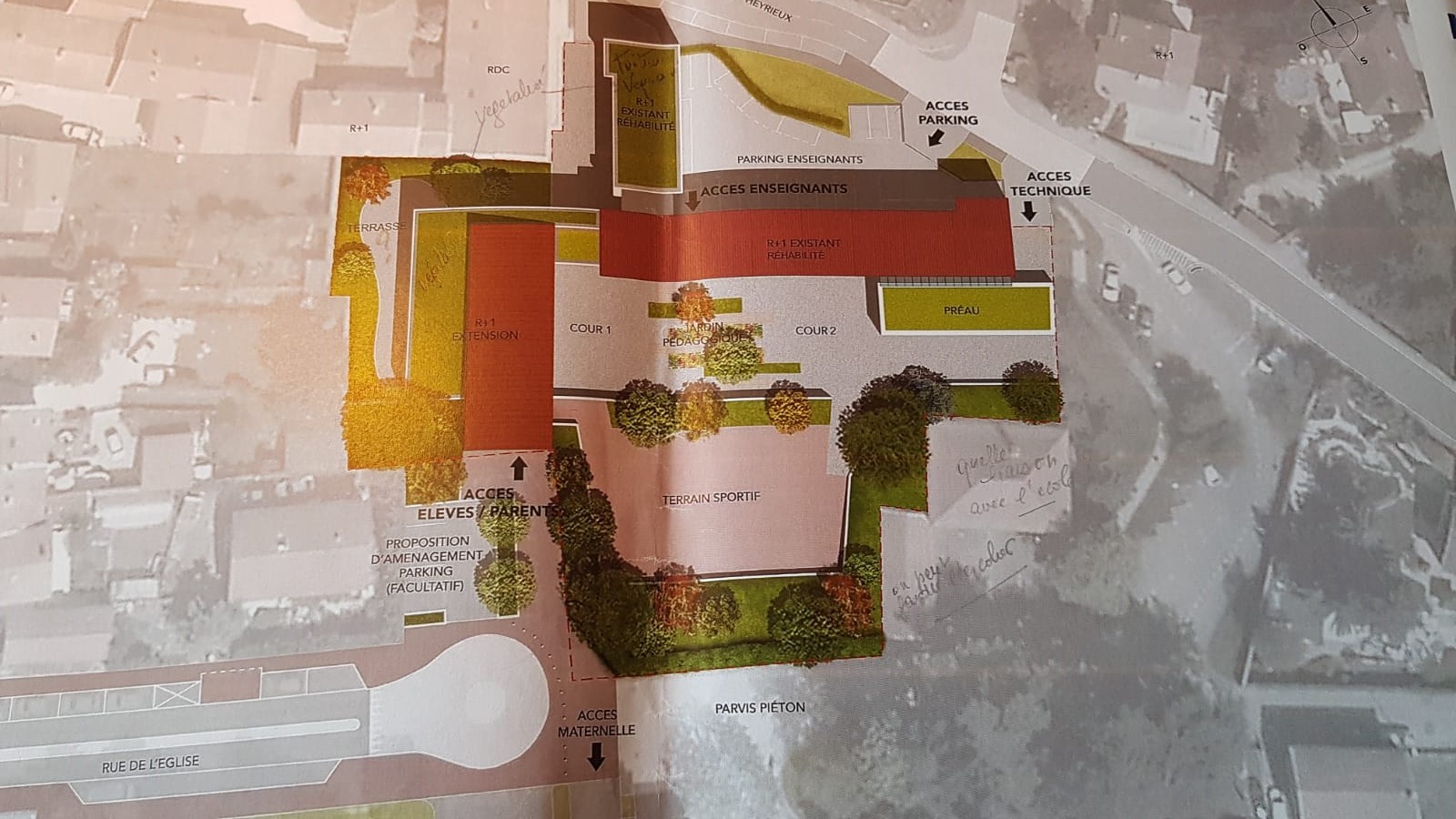 - de la destruction de notre patrimoine local pour un projet qui n'offrira pas plus de classes que l'agrandissement prévu annulé et jeté à la poubelle par le maire- sans compter l'endettement de notre commune, la vente de parcelles et terrain de sport pour financer cette opération ubuesque !