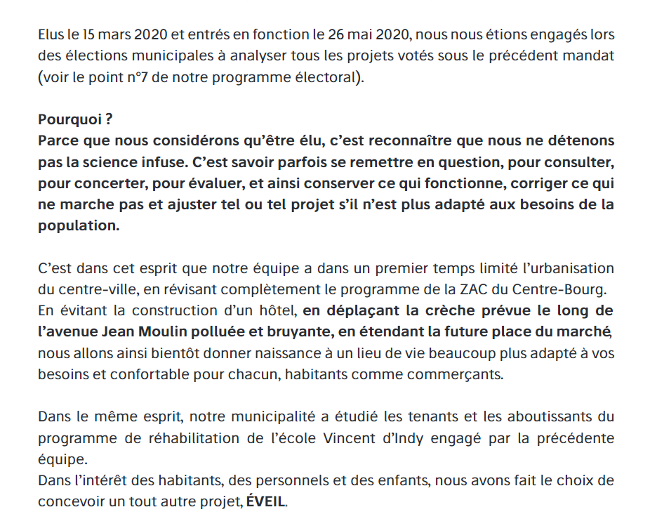 Aucun pilotage de l'achat public et aucune anticipation pas de formalisation non plus : le projet EVEIL aurait pu être optimisé, mais la gestion au coup par coup de ce projet a coûté cher à la commune ! Des achats hors marchés et sans mise en concurrence, ce qui est hors législation, alors que nous avions posé la question, cf PV du 12 octobre 2023, et que le maire nous avait assuré avoir consulté « dans les règles de l'art », sûrement voulait-il parler de SES règles !