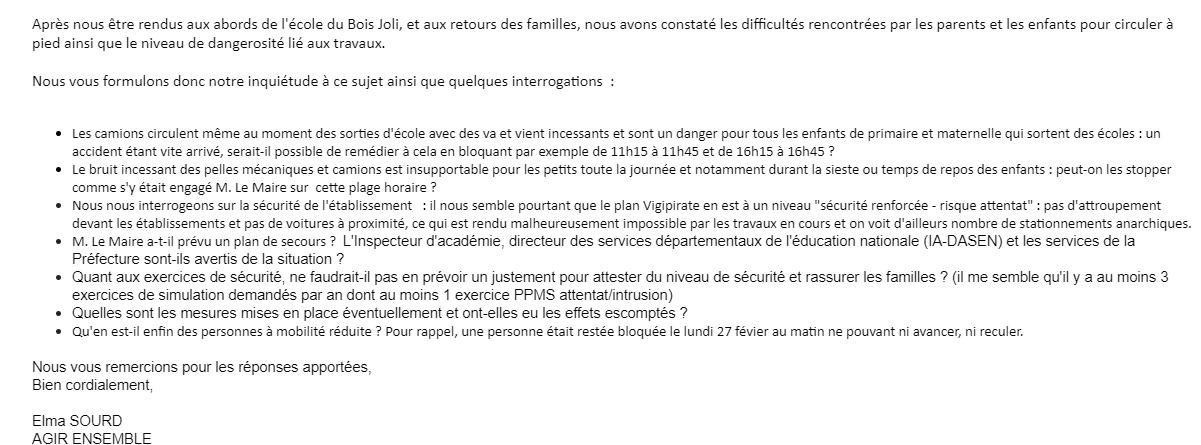 " Madame, les parents d'élèves ont toutes les possibilités à travers les conseils d'école comme celui du 14 mars prochain d'évoquer les problèmes liés au chantier. D'ailleurs, ce point est bien inscrit à l'ordre du jour. La municipalité présente répondra à ces points. De plus, les réponses qui seront apportées mardi prochain vous seront transmises lors de la prochaine commission enfance/petite enfance à laquelle vous faites partie. Bien à vous"